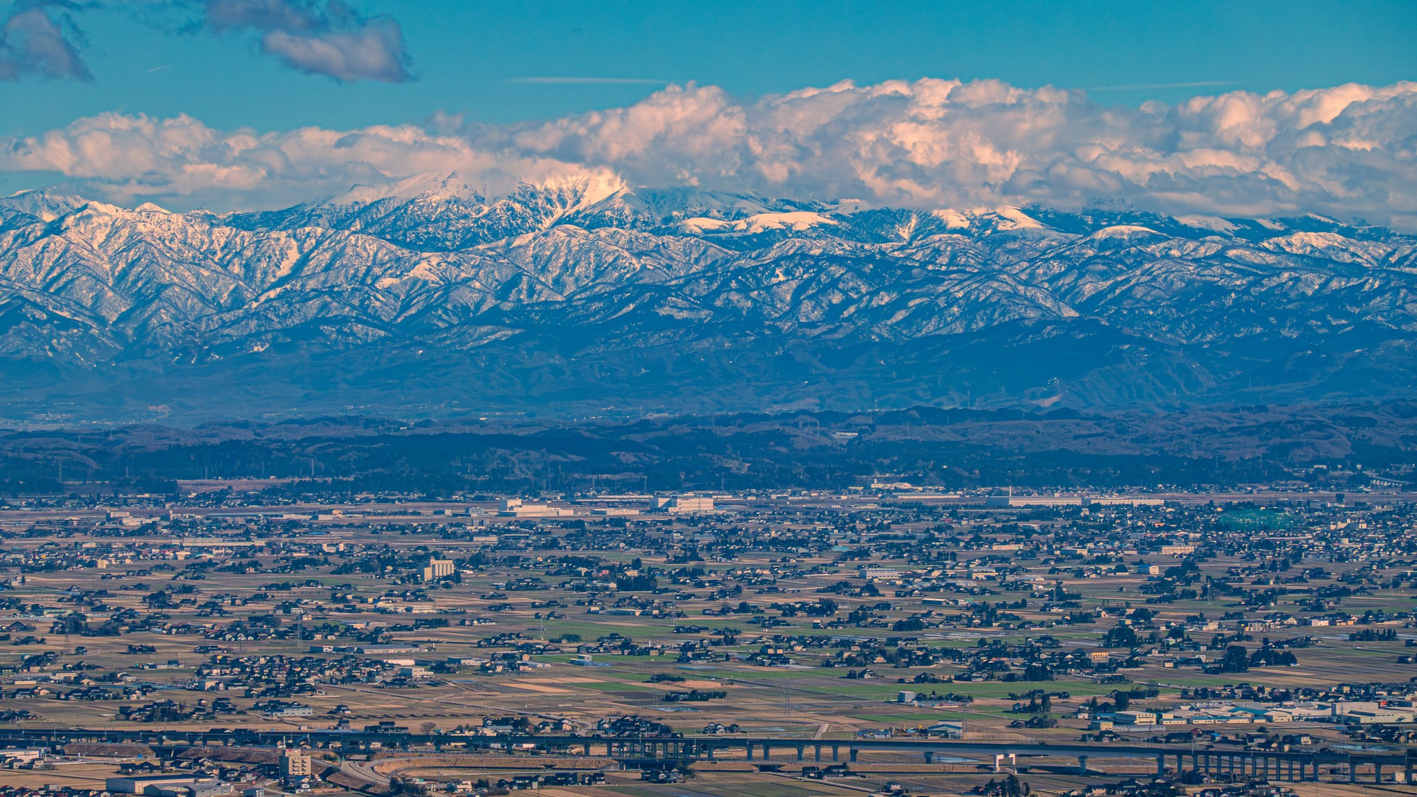 写真は2024年2月18日(日)に撮影した稲葉山からの砺波平野と北アルプスの写真です。昼間はこのようなダイナミックな風景を、夜間は煌びやかな夜景を楽しむことができるスポットです。